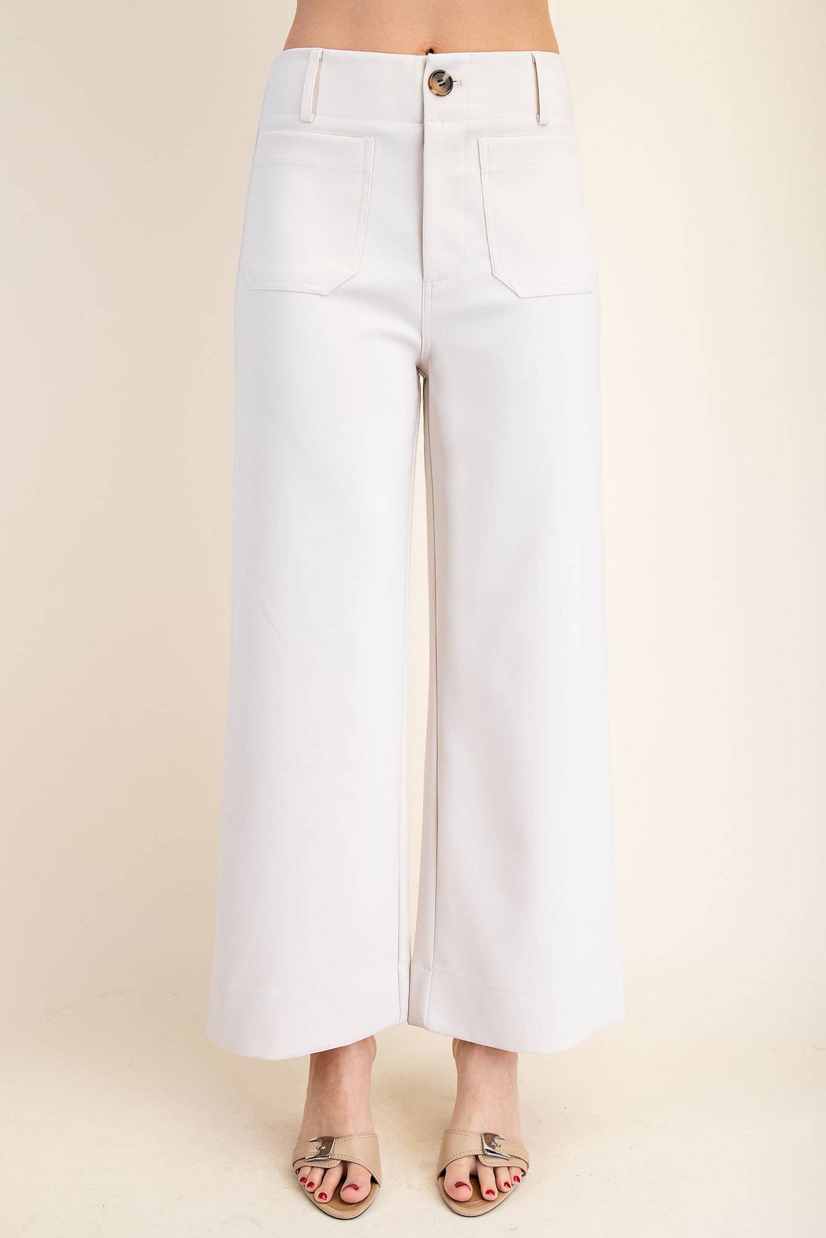 Elevate your everyday style with our high-waisted wide leg trousers in crisp white, designed to blend timeless tailoring with modern flair. These structured yet comfortable pants feature a flattering high rise, front patch pockets, and a wide-leg silhouette that’s both elongating and elegant.