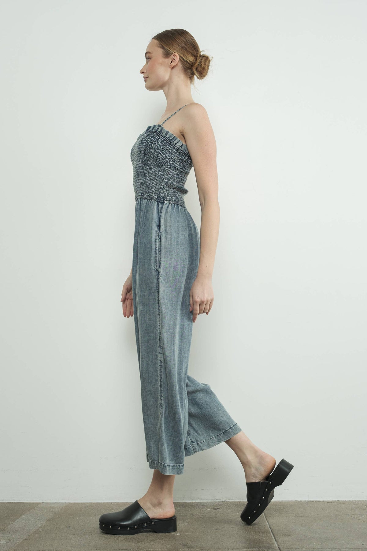 Say hello to your new wardrobe essential! This smocked denim jumpsuit combines comfort, style, and ease for the ultimate everyday look. Featuring a flattering smocked bodice with adjustable spaghetti straps and a relaxed wide-leg silhouette, it's perfect for weekend brunch, market strolls, or casual date nights.