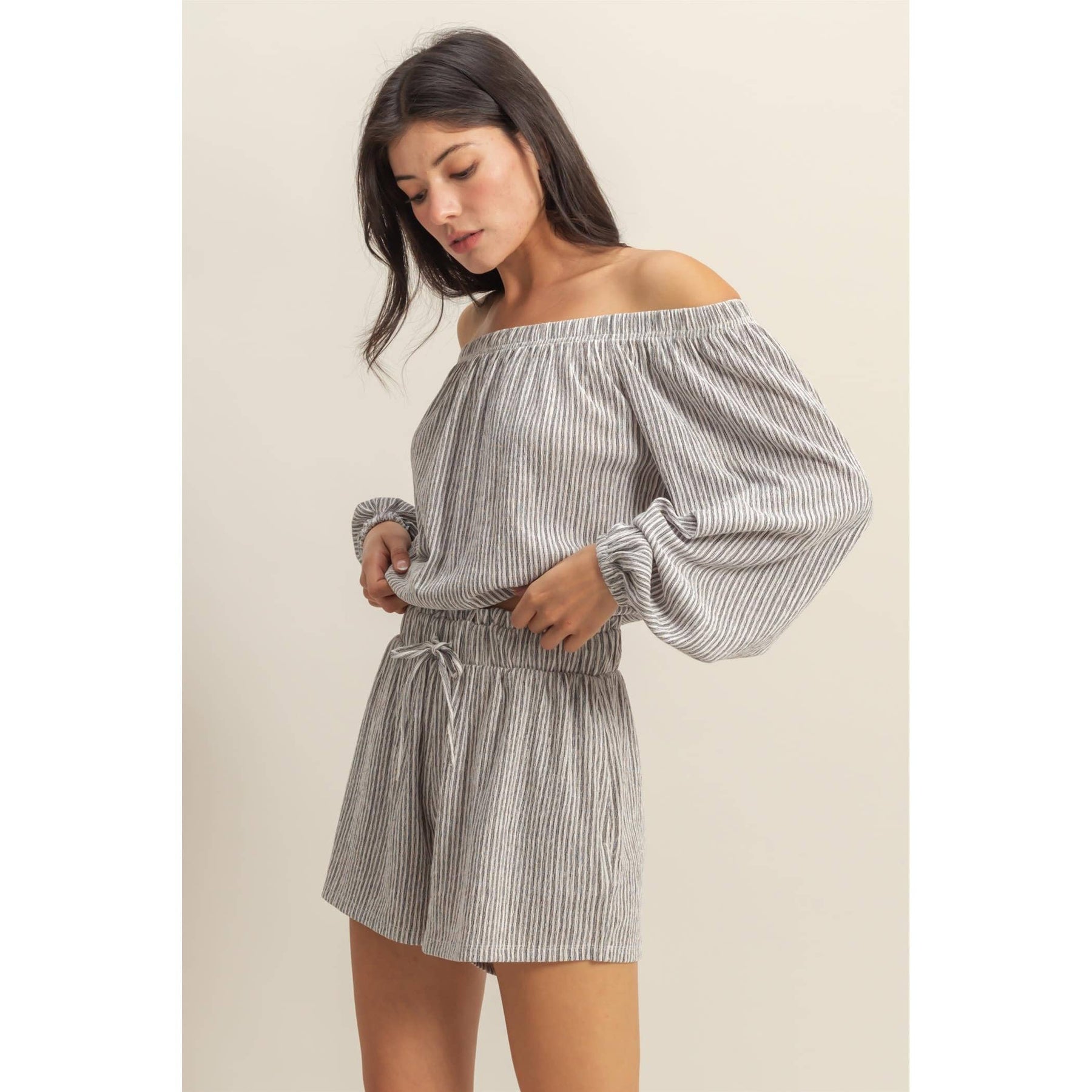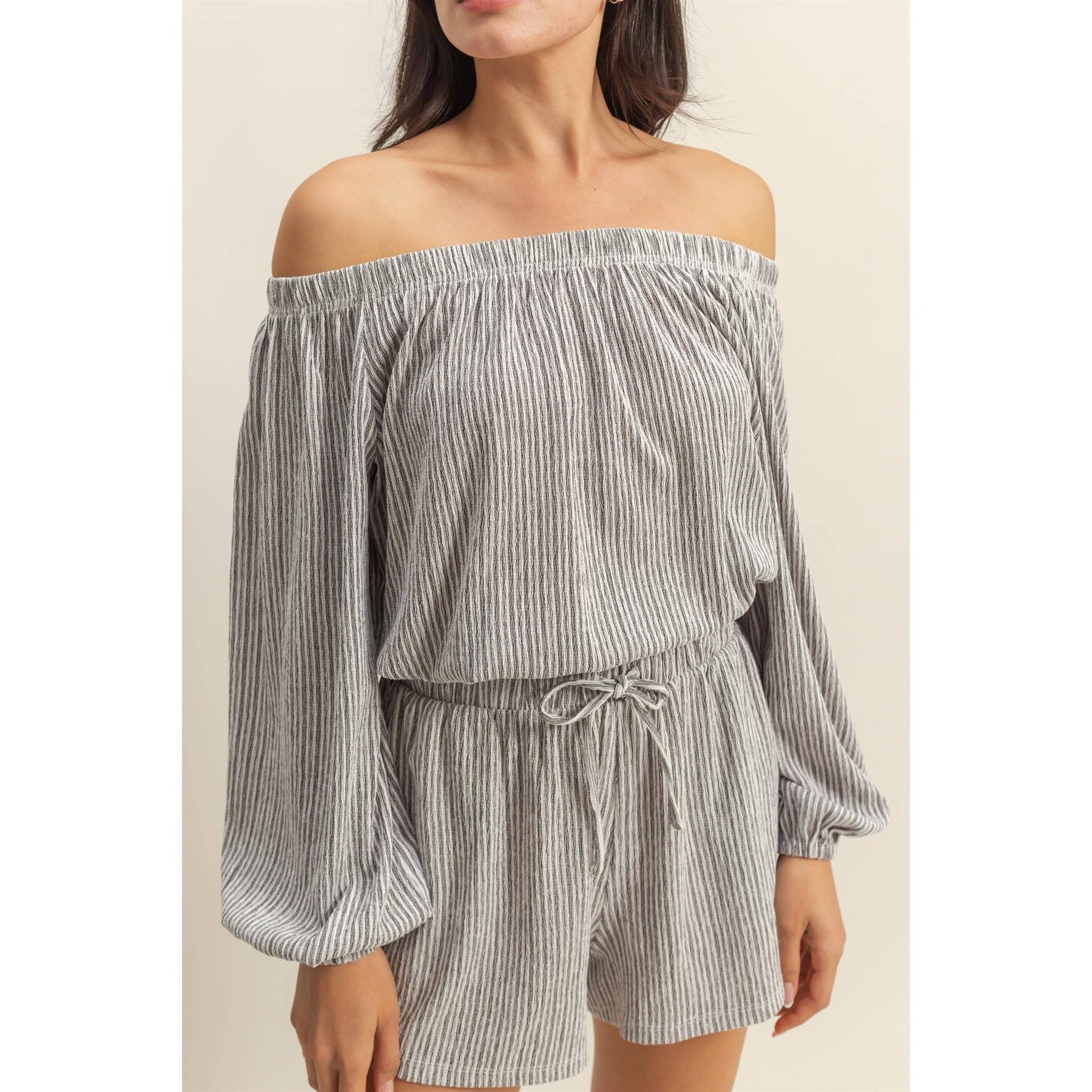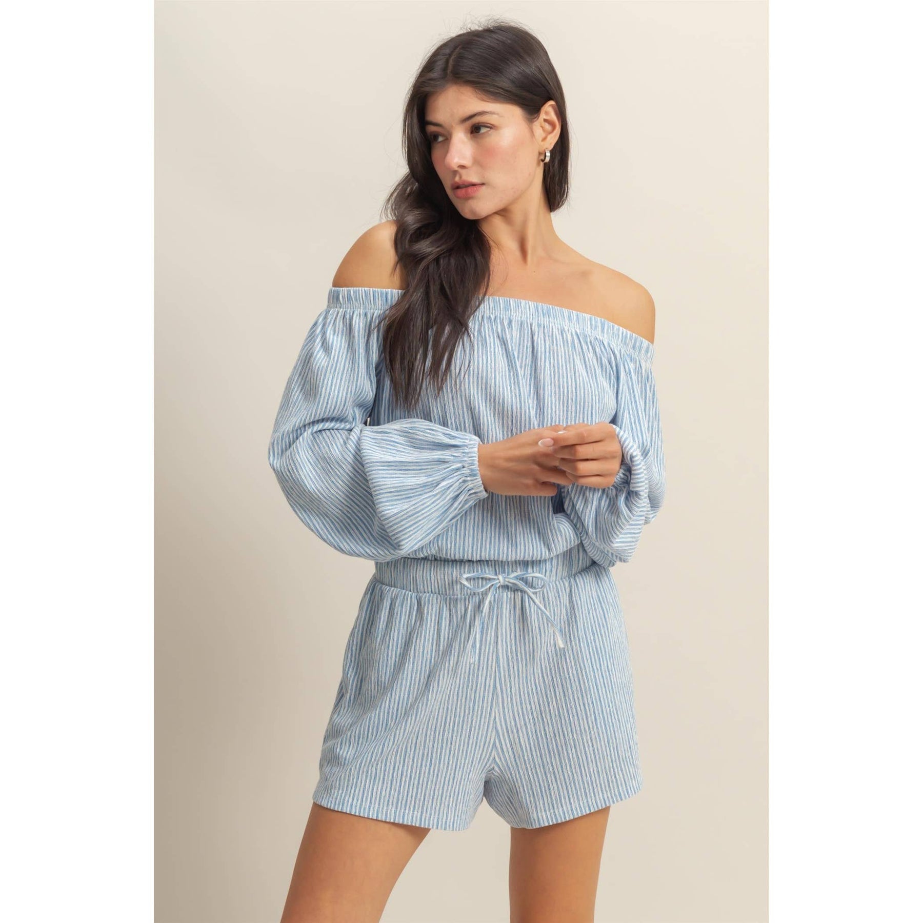 Light, breezy, and effortlessly chic — this pink off-the-shoulder romper is the ultimate one-piece wonder for sunny days and sweet escapes. Designed with subtle vertical stripes, voluminous long sleeves, and a flattering drawstring waist, it’s made for beach strolls, brunch dates, or backyard soirees.